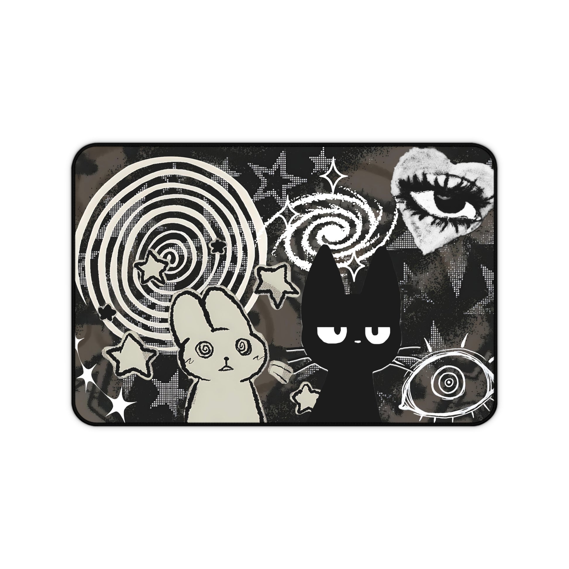 Give your setup an edgy upgrade with this trippy mousepad featuring a dazed bunny and a deadpan black cat surrounded by swirling eyes, cosmic spirals, and offbeat stars. With strong black-and-white contrast and raw textures, this alt desk mat is perfect for fans of weirdcore, grunge, or emo kawaii aesthetics. Whether you're gaming, journaling, or just spiraling (literally), this mousepad will keep your space chaotic in the best way.